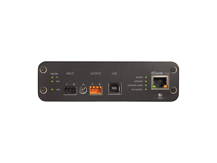 Get A QuoteAudio network interface connects up to 4 Dante channels and 1 analog output to a room's audio and video conferencing system via USB connection. Internal matrix mixer offers flexible routing, allowing users to route any input to any output.