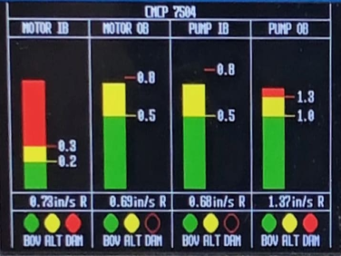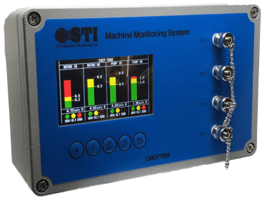 Get A QuoteThe CMCP7504 Four Channel Machinery Monitoring System is a four channel API 670 compliant continuous monitoring system for use with Proximity Probes, Accelerometers, Velocity Transducers, and Analog Output sensors. In addition, the system also allows for a single temperature and speed input for readout and visual alarming. A 4.3" LCD display provides easy to read bar graphs for the overall vibration value and alarm indicators