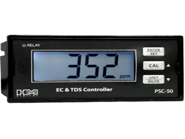 The HM Digital PSC‑50 is a TDS/EC water quality controller designed to monitor and regulate total dissolved solids (TDS) and electrical conductivity (EC) levels. It features a bright LED display for real‑time readings, automatic temperature compensation, adjustable alarm set points, and a relay output that activates when measured levels exceed the user‑defined threshold, making it suitable for water treatment systems and commercial applications.