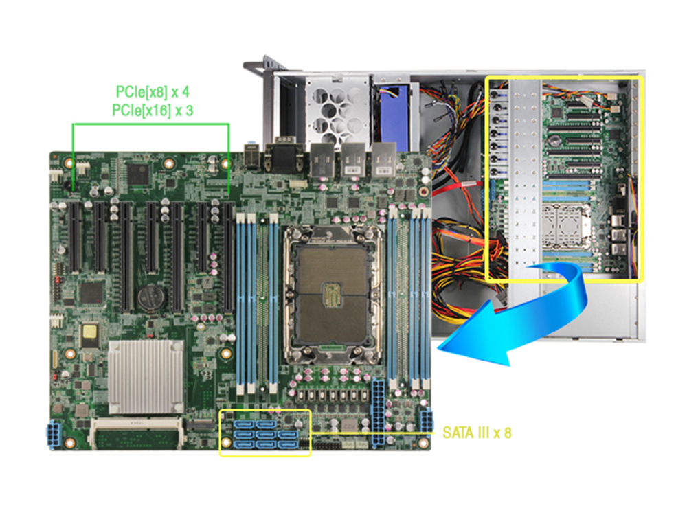 Containing seven PCIe slots with up to Gen 4 speed, the ZEUS-WHI0 is capable of supporting up to four GPU cardS (per project basis) to handle multiple concurrent AI processes and enhance graphics realization, meaning no task is too heavy to handle. Further to this, the ZEUS-WHI0 also holds expanded storage options, with eight 2.5” or 3.5” HDD supported via two 4-bay inputs.